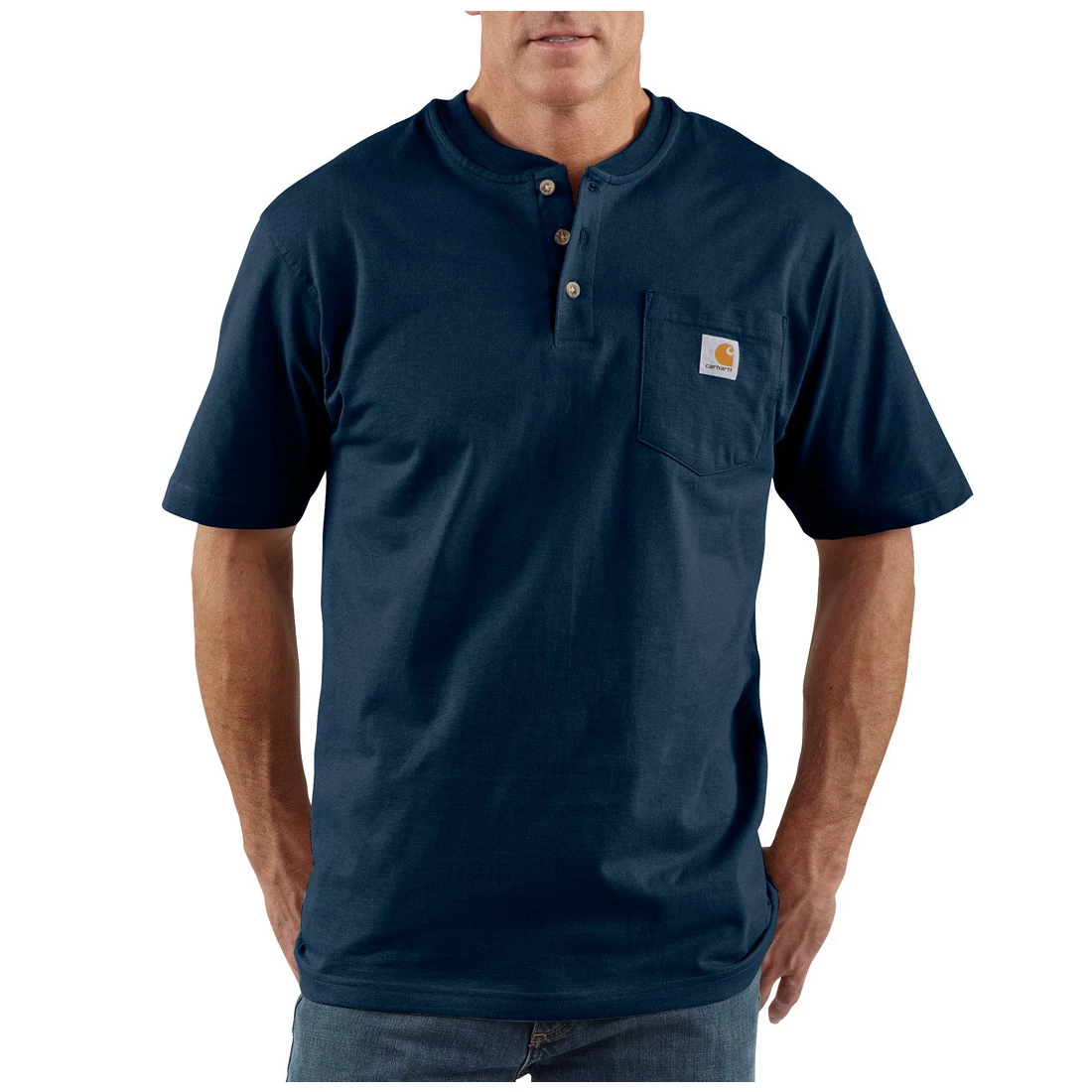 This men’s short-sleeve henley t-shirt is built to last from heavyweight cotton jersey. Cut with an original fit so you have room to move. A Carhartt patch sits on the chest pocket. Solid colors: 6.75-ounce, 100% cotton jersey knit; Heather Gray: 90% cotton / 10% polyester jersey knit; All other heathers: 60% cotton / 40% polyester jersey knit Original fit Henley collar with three-button front Rib-knit crewneck holds its shape throughout the day Side-seam construction minimizes twisting Left-chest pocket with sewn-on Carhartt patch Tagless neck label for a smooth feel Model height: 6’2″; Chest size: 40.5″; Wearing size M Imported