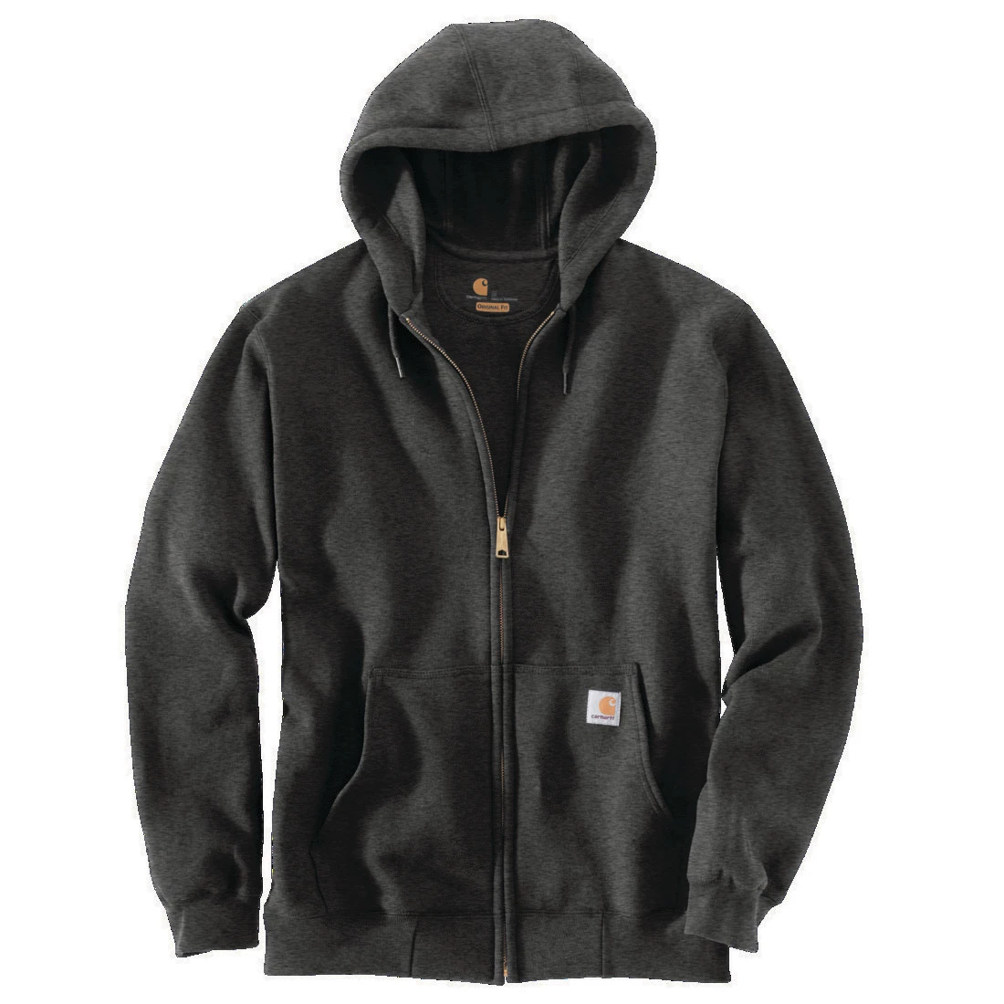 This men’s hooded Carhartt sweatshirt is built for cool days on the job or frosty nights at the camp site. It’s made of a midweight cotton blend for everyday comfort and durability. Most colors: 10.5-ounce, 50% cotton / 50% polyester blend; Charcoal Heather: 55% cotton / 45% polyester; Heather Gray: 70% cotton / 30% polyester Original fit Full zip front with brass zipper Attached three-piece hood with drawcord Rib-knit cuffs and waist help keep out the cold Two front handwarmer pockets Carhartt patch sewn on pocket Imported