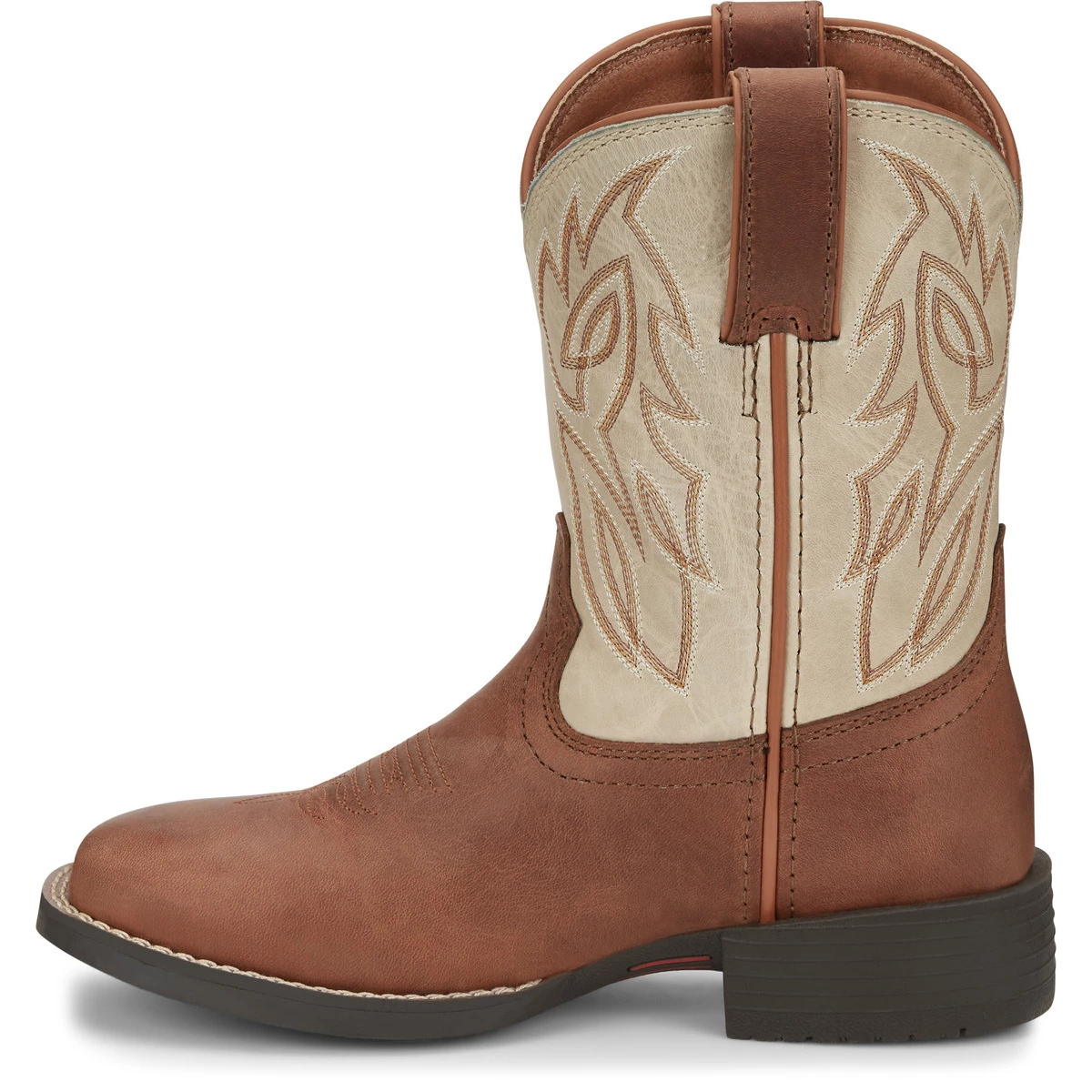 Crafted for the junior cowboy, the Canter in Brown features classic styling in a boot that’s designed to grow with him. Inspired by our men’s version with a wide square toe and contrast stitching, this clever two-tone leather boot features our Room 2 Grow removable orthotic insole that can be removed as your child’s foot grows, adding an extra half size to the boot. A rubber sole provides the flexibility and traction he needs.