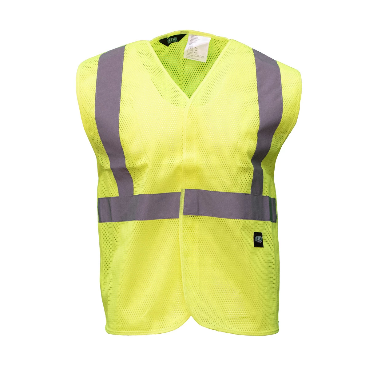 The KEY ANSI Class 2 Hi-Visibility Break-A-Way Mesh Vest is designed for when you need visibility and security. The Hi-Vis yellow with sewn on reflective striping gives you enhanced visibility. Velcro^ closures on the front, shoulders and sides ensure a safe break-a-way, should you get caught on moving parts or machinery. The large neck and arm openings give you room to move, while the breathable mesh material ensures comfort all year round. Rated ANSI Class 2 and ANSI/ISEA 107-2010 compliant. For safe workwear you can trust, choose KEY.