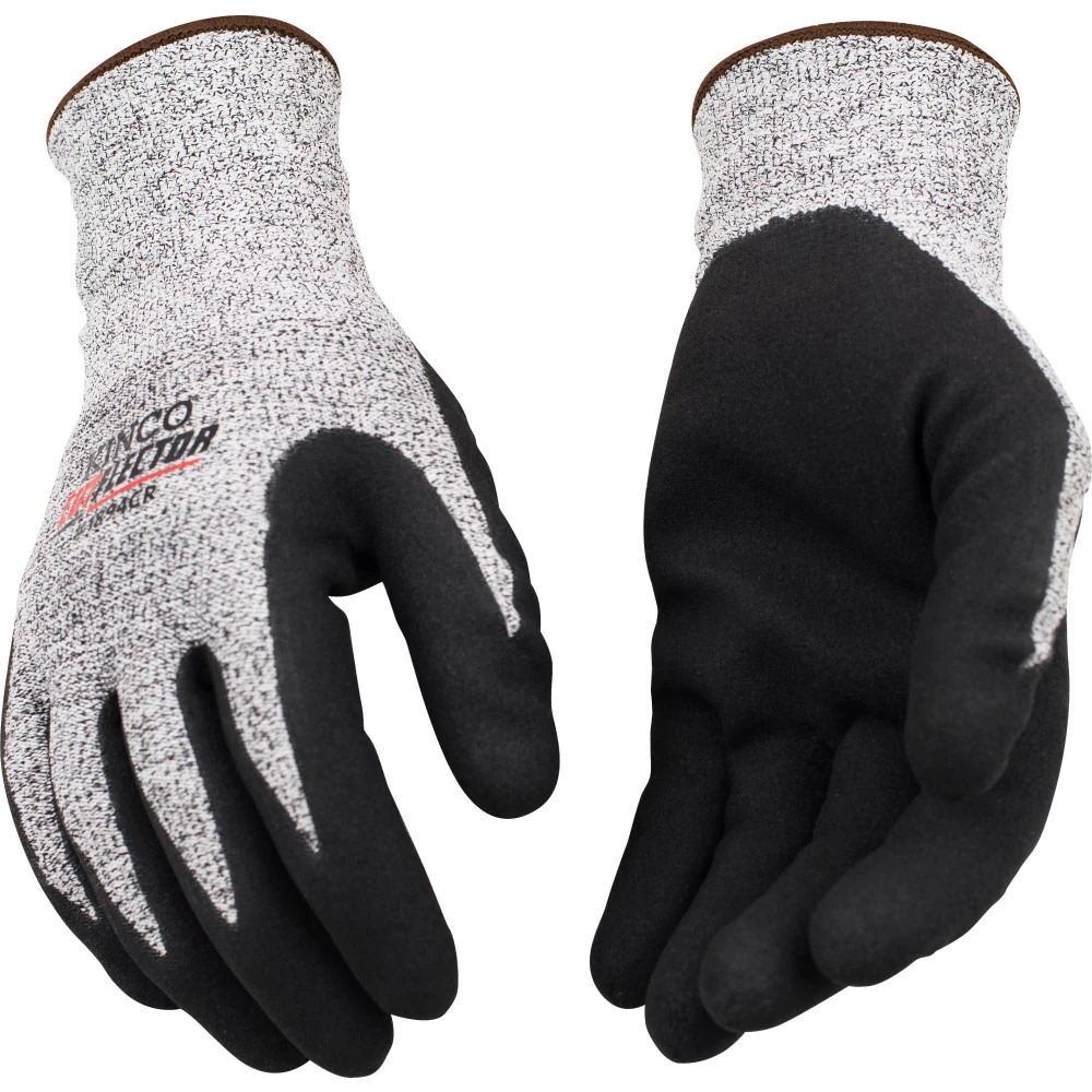 Speckled gray cut-resistant 13-gauge knit shell, which is a blend of high performance polyethylene (HPPE) filament, glass fiber, & polyester, provides superior protection against cuts & abrasions