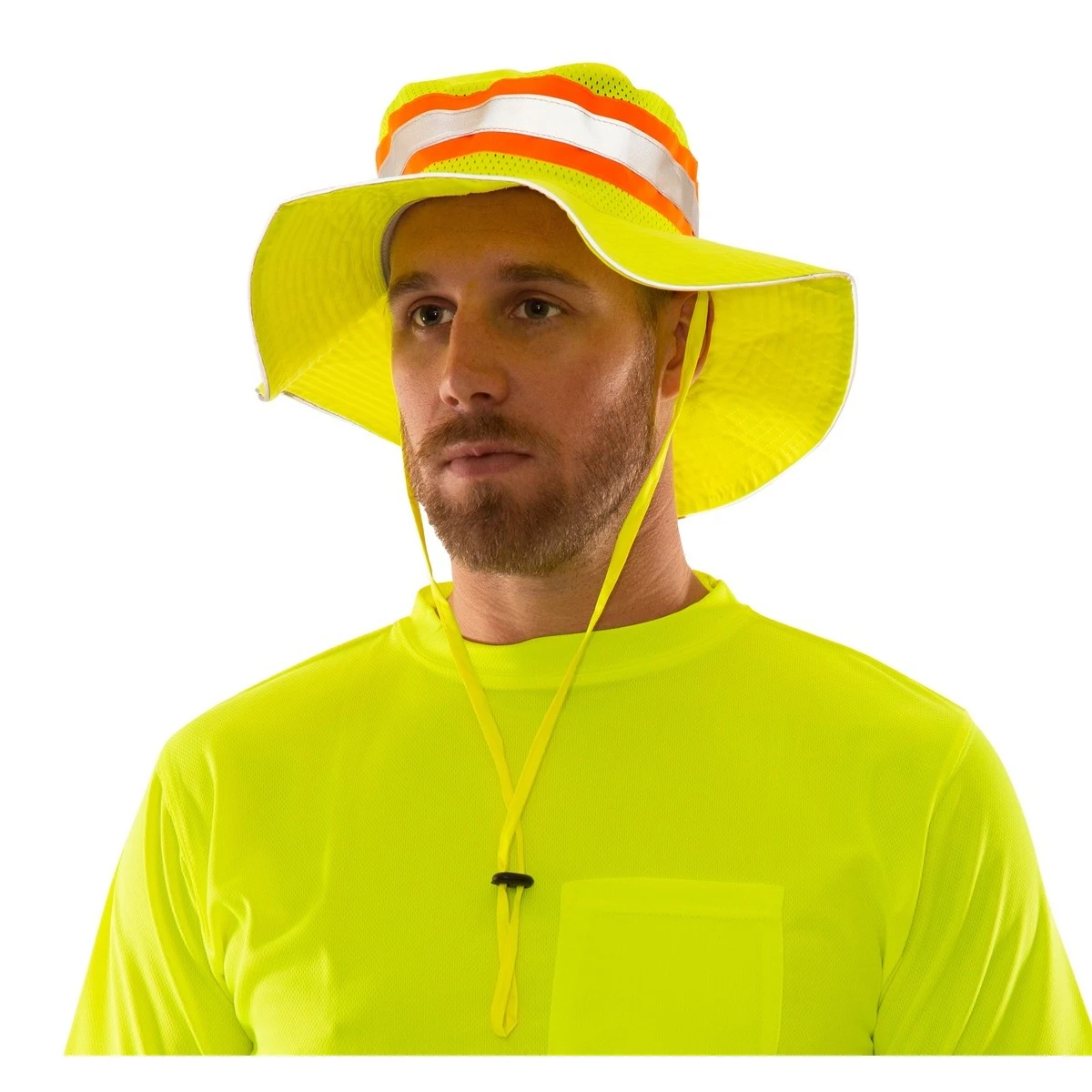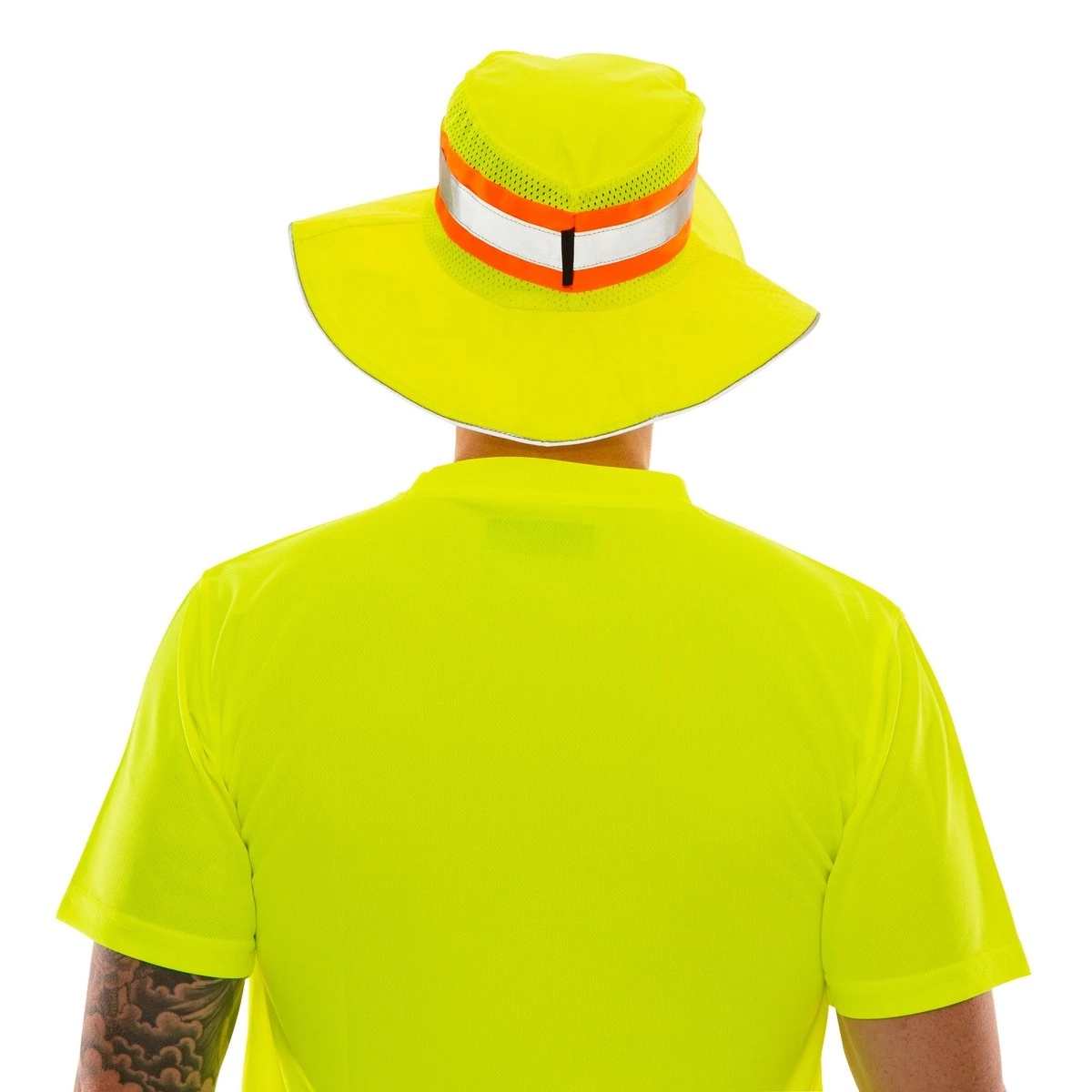 Fluorescent colored background material enhances visibility for additional daytime conspicuity. Reflective trim on the brim for added nighttime visibility