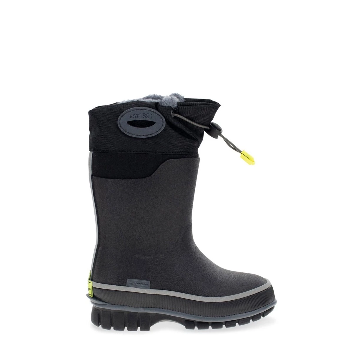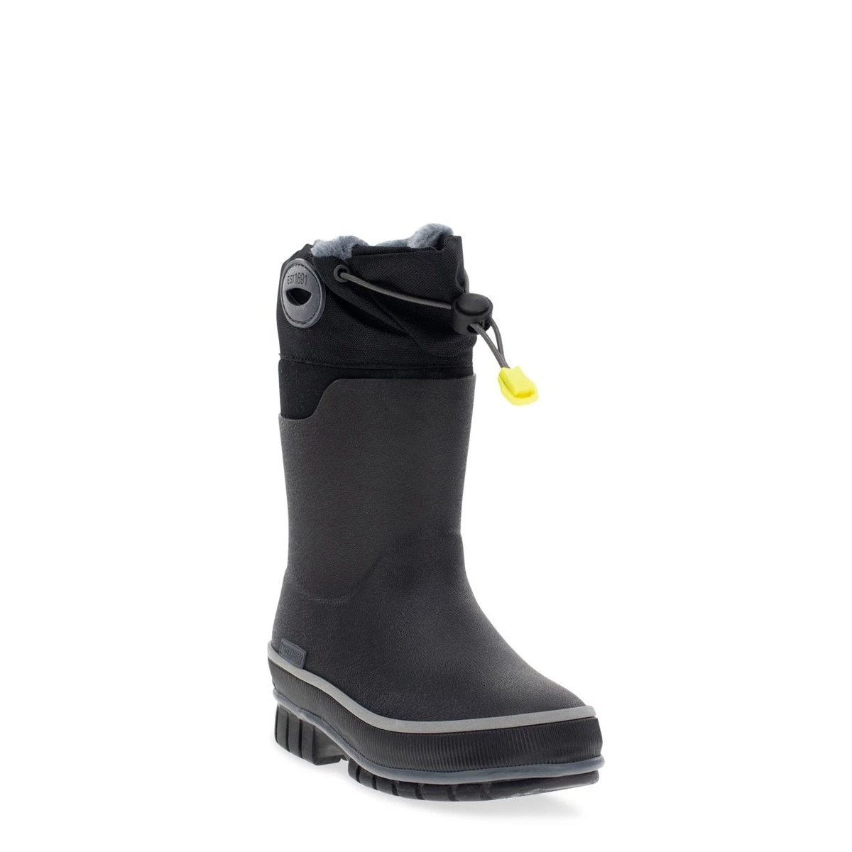 Black waterproof and warm winter snow boots. Easy pull-on handles that are keep the wind out. An adjustable toggle closure for a snug fit. These boots are cold-rated to handle brisk temperatures as low as -30 degrees