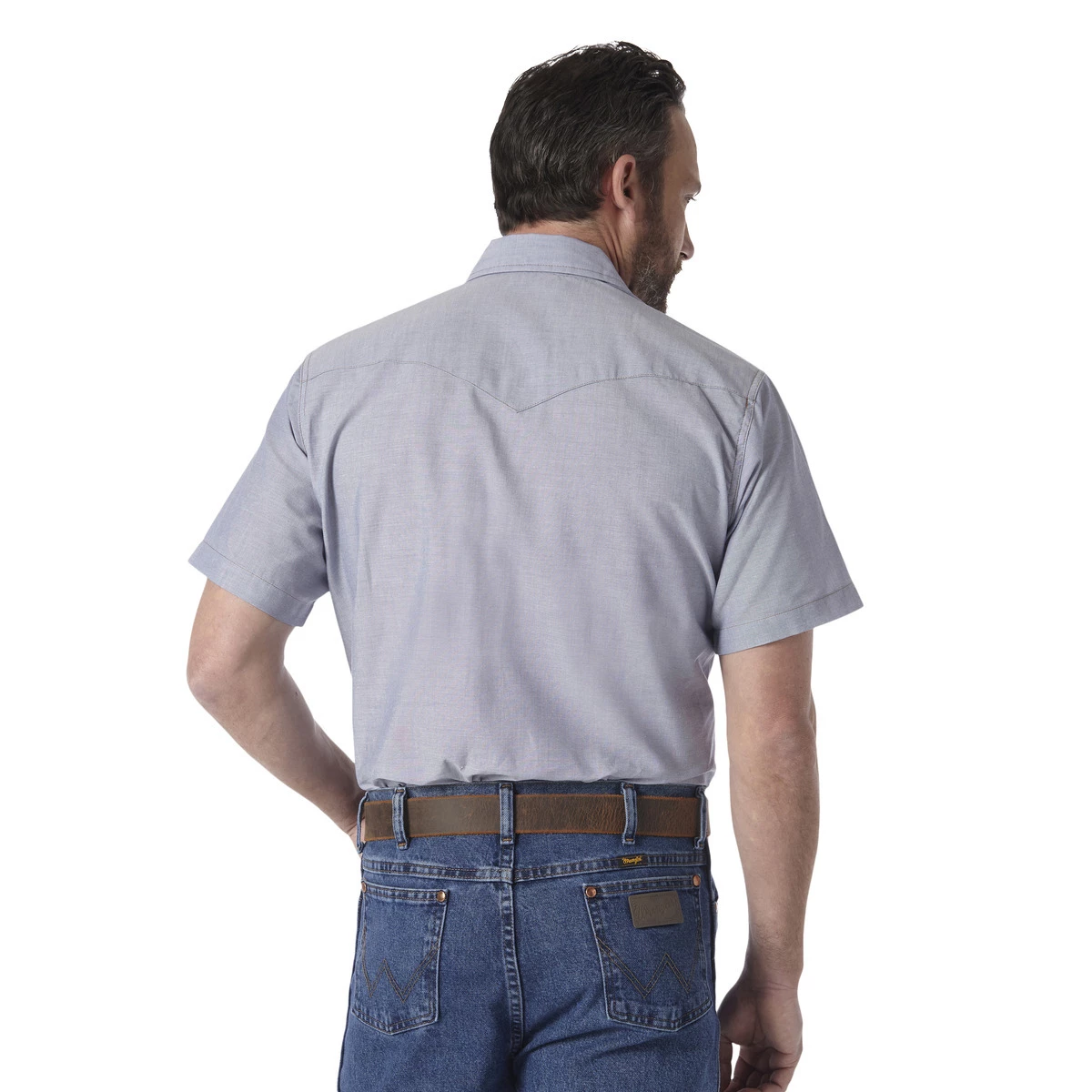 his lightweight Wrangler Short Sleeve Western Snap Chambray Work Shirt is the perfect solution for every working cowboy. The classic Cowboy Cut fit is loose enough to layer a tee or tank underneath. Made from a durable, breathable cotton chambray blend, this shirt will maintain the soft, lightweight feel you require with the look of denim, but not the added bulk. Up for any challenge, this shirt is the essence of function and practicality. Hard-working cowboys have trusted Wrangler for years to provide them with high quality workwear without compromising their authentic Western style. This shirt is no exception. Traditional Western yokes on the front and back of the shirt combined with snap closures and a spread collar pull together a look that is practical for your daily grind yet decidedly all cowboy. Classic Wrangler elements include our signature “W” stitching on the pockets, and the left pocket features a convenient pencil slot paired with our Wrangler logo riser label. The Western-inspired spade flap front pockets also feature snap closures radiating true cowboy style at its finest.